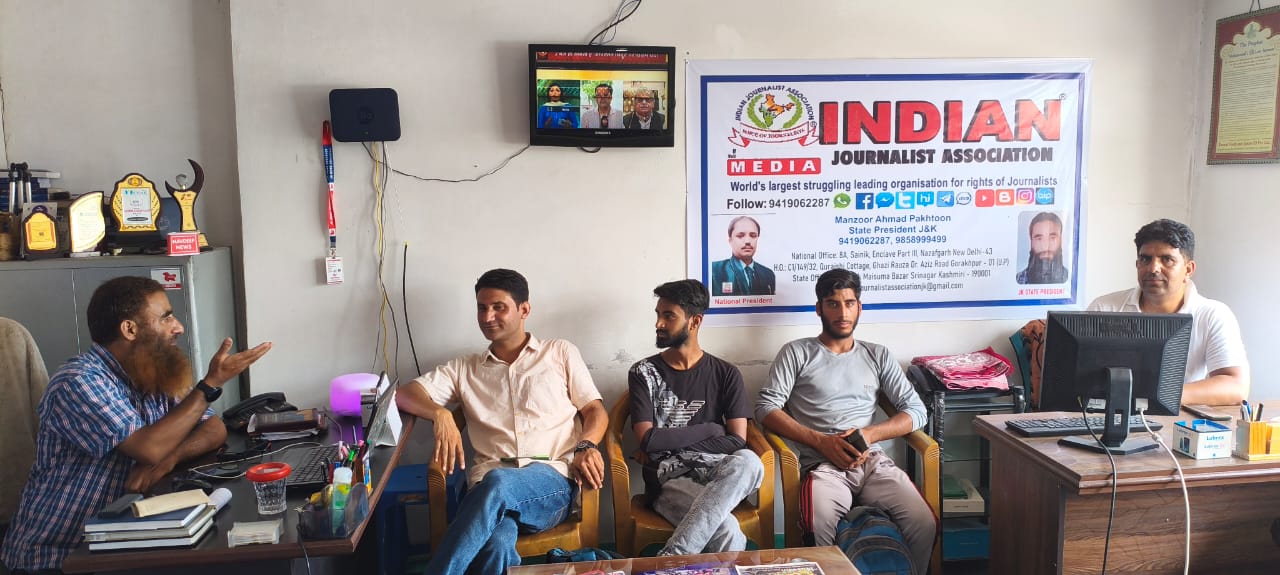 During this interactive session, registered and new members of Indian Journalist Association, Kashmir media persons were present including State General Secretary Kabir Gilani, State Spokesperson Asif Manzoor Daily Jammu Jottings, Shuja Bakal 4tv, Peer Arafat Shree News, Imran Rasool The Revolutionary, Muhammad Hussain Khan Navdeep News, Bayanat The Revolutionary, Sahil Mehraj JK News Observer and Suhaib Ismail Ab Tak JK. All the participants shared the challenges, suggestions and tips faced by the journalists and expressed their faith and appreciation towards Indian Journalist Association. Indian Journalist Association has been involved in giving its full contribution to protect the interests of all journalists of India, honouring journalists, promoting freedom of journalism and protecting the rights of journalists. State President of Indian Journalist Association Manzoor Ahmad Pakhtoon thanked all the interactive session participants and assured all possible assistance/facilities for the professional development of journalists through the platform of Indian Journalist Association.
