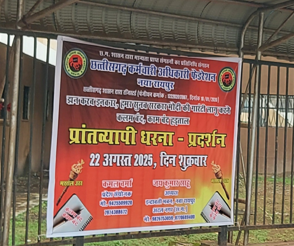 रायपुर। ‘छत्तीसगढ़ अधिकारी-कर्मचारी फेडरेशन’ के बैनर तले आज करीब पांच लाख कर्मचारी हड़ताल पर है. कर्मचारियों ने अपनी 11 सूत्रीय मांगों को लेकर कलमबंद कामबंद आंदोलन कर कार्यालयों का बहिष्कार किया. इसके साथ ही मांगें पूरी न होने पर अनिश्चितकाल हड़ताल पर जाने की भी चेतावनी दी है।