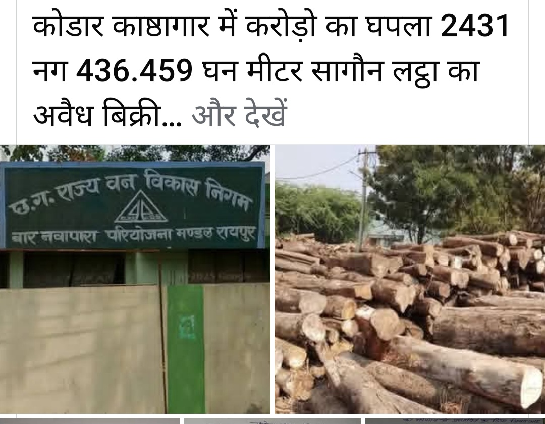 छत्तीसगढ़ वन विकास निगम बारनवापारा परियोजना मंडल के कोडार काष्ठागार डिपों में करोड़ो का घपला 2431 नग 436.459 घन मीटर सागौन लट्ठा का अवैध बिक्री
