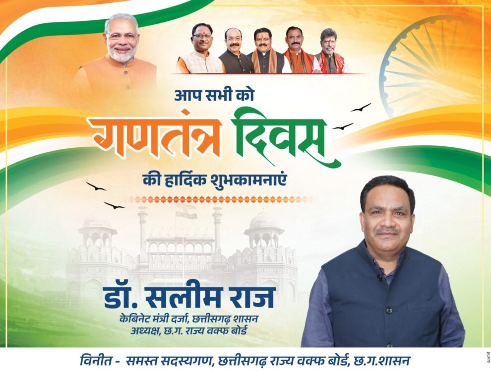 26 जनवरी 2026, रायपुर छ.ग। देश के 77 वें गणतंत्र दिवस के पावन अवसर पर डाॅ.सलीम राज, माननीय अध्यक्ष, छ.ग.राज्य वक्फ बोर्ड (केबिनेट मंत्री दर्जा, छ.ग.शासन) ने कार्यालय छ.ग.राज्य वक्फ बोर्ड में ध्वजारोहण किया, ध्वजारोहण उपरांत राष्ट्रगान का गायन किया गया तथा गणतंत्र दिवस की बधाई दी गई। इस अवसर पर छ.ग.राज्य वक्फ बोर्ड के माननीय सदस्यगण श्री मोहम्मद फिरोज खान, श्री फैसल रिजवी (वरिष्ठ अधिवक्ता), श्री रियाज हुसैन के साथ छ.ग.राज्य वक्फ बोर्ड की मुख्य कार्यपालन अधिकारी शिम्मी नाहिद, लेखा अधिकारी पवन कुमार व बोर्ड कार्यालय के समस्त कर्मचारीगण उपस्थित रहे।